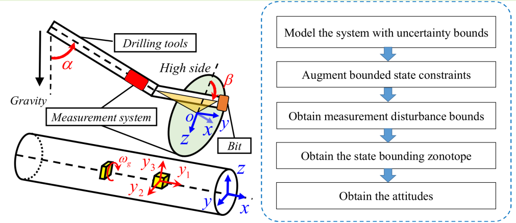 钻井工具的姿态估计对于钻井工程至关重要。然而,现有研究在有界约束利用、不确定性描述和扰动鲁棒性方面存在不足。该论文提出了一种鲁棒状态约束集员观测器,其中有界状态约束被增广,并利用集合协变估计扰动边界。然后,理论分析证明了有界状态约束能够减少估计误差集合尺寸。特别是,利用状态范围约束保证了误差有界性和扰动鲁棒性。最后,仿真和实验结果表明,该方法充分利用了有界约束,具有比现有方法更高的估计精度和更强的扰动鲁棒性。