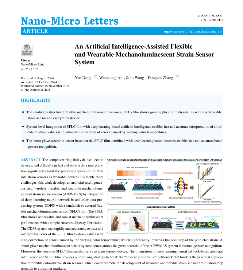 近日,我院董炎副教授在柔性可穿戴应变传感器方面取得进展,相关研究成果“An artificial intelligenceassisted flexible and wearable mechanoluminescent strain sensor system”(《人工智能辅助的柔性可穿戴力致发光比色应变传感器系统》)发表在《Nano-Micro Letters》。《Nano-Micro Letters》是微纳米技术领域权威期刊的国际知名期刊,目前影响因子为36.3(SCI一区)。论文第一作者为董炎副教授,通讯作者为董炎副教授和张冬至教授,yl23411集团为唯一署名单位和通讯单位,该研究得到国家自然科学基金项目、山东省泰山学者项目、山东省海外优青等项目的资助支持。