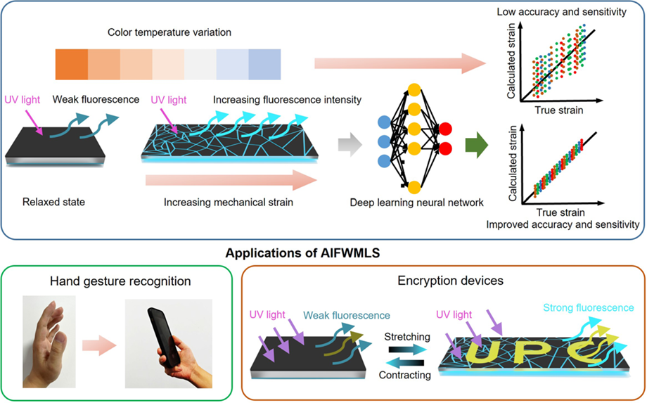 针对柔性可穿戴应变传感器通过复杂布线与设备相连实现信号转换,导致高功耗、信号读取延迟、现场检测解析困难等问题,团队研发了柔性无线无源可穿戴力致发光比色可视化传感技术,提出一种人工智能辅助的无线、柔性、可穿戴的力致发光比色应变传感器系统。通过构建三明治结构柔性可穿戴力致发光薄膜传感器与基于轻量级卷积循环深度学习算法的色彩数据处理系统深度集成,实现了力致发光应变传感薄膜颜色的快速提取、解析和自动校正,拓展了可穿戴应变传感器在运动监测、姿态识别等领域的应用潜力。