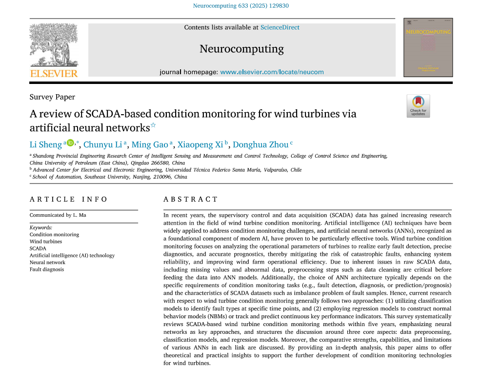 近日,我院控制科学与工程专业盛立教授团队在基于SCADA的风力涡轮机状态监测综述方面取得进展,相关研究成果A review of SCADA-based condition monitoring for wind turbines via artificial neural networks发表在《Neurocomputing》。《Neurocomputing》是人工神经网络领域的国际知名期刊,目前影响因子为6.5(SCI二区)。论文第一作者为盛立教授,第二作者为博士研究生李春昱,通讯作者为盛立教授,yl23411集团为第一署名单位和通讯单位,该研究得到国家重点研发计划、国家自然科学基金、山东省自然科学基金和山东省泰山学者研究基金的资助支持。