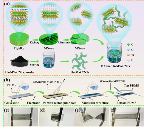 柔性传感器具有优异的机械适应性,能够适应多种工作环境,可无缝贴合人体或不规则物体的表面,在人体运动追踪、胎压监测及人机交互等领域得到了广泛应用。本文制备了一种三明治结构的MXene/螺旋多壁碳纳米管(Hs-MWCNTs)柔性应变传感器。所制备的传感器具有检测范围宽(0-77%)、灵敏度高(灵敏系数为243.6)、可重复性高(超35000次循环)等优异的性能。MXene/Hs-MWCNTs柔性应变传感器在检测人体脉搏、胎压等微小信号方面具有显著优势。本工作所构建的4×4柔性传感阵列能够实现不同形状物体的压力分布检测。此外,基于MXene/Hs-MWCNTs柔性应变传感器与连续小波变换卷积神经网络算法,成功实现了部分英语单词的语音识别,识别准确率可达94.4%。研究结果表明,MXene/Hs-MWCNTs柔性应变传感器在人体运动检测、健康监测及语音识别等领域具有巨大的应用潜力。