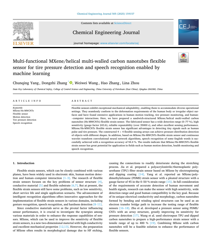 近日,我院张冬至教授团队在柔性传感器方面取得进展,相关研究成果以“Multi-functional MXene/helical multi-walled carbon nanotubes flexible sensor for tire pressure detection and speech recognition enabled by machine learning”(基于机器学习的多功能MXene/螺旋多壁碳纳米管管柔性传感器用于胎压检测与语音识别)发表在《Chemical Engineering Journal》。《Chemical Engineering Journal》是化学工程领域的国际知名期刊,目前影响因子为13.5(SCI一区)。论文第一作者为精密测量与测控仪器专业2024级博士研究生杨春卿,通讯作者为张冬至教授,yl23411集团为唯一署名单位和通讯单位,该研究得到国家自然科学基金项目、泰山学者工程专项经费、山东省自然科学基金项目、青岛市自然科学基金项目、中央高校基本科研业务费专项资金,以及yl23411集团深部油气国家重点实验室开放基金项目的资助支持。