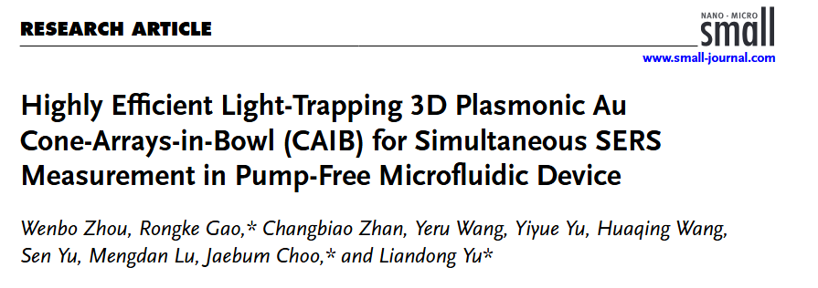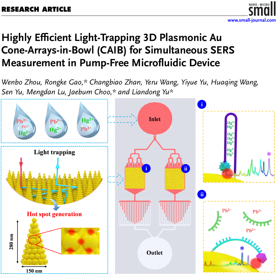 近日,我院控制科学与工程专业2022级博士研究生周文博在痕量重金属离子检测方面取得进展,相关研究成果《Highly Efficient Light-Trapping3D Plasmonic Au Cone-Arrays-in-Bowl (CAIB) for Simultaneous SERS Measurement in Pump-Free Microfluidic Device》发表在《Small》。《Small》是纳米科学与纳米技术领域的国际知名期刊,目前影响因子为12.1SCI二区)。论文第一作者为周文博,通讯作者为于连栋教授、高荣科教授和韩国中央大学Jaebum Choo教授,yl23411集团为第一署名单位和通讯单位,(韩国中央大学为第二署名单位和通讯单位),该研究得到国家自然科学基金区域创新发展联合基金的资助支持。