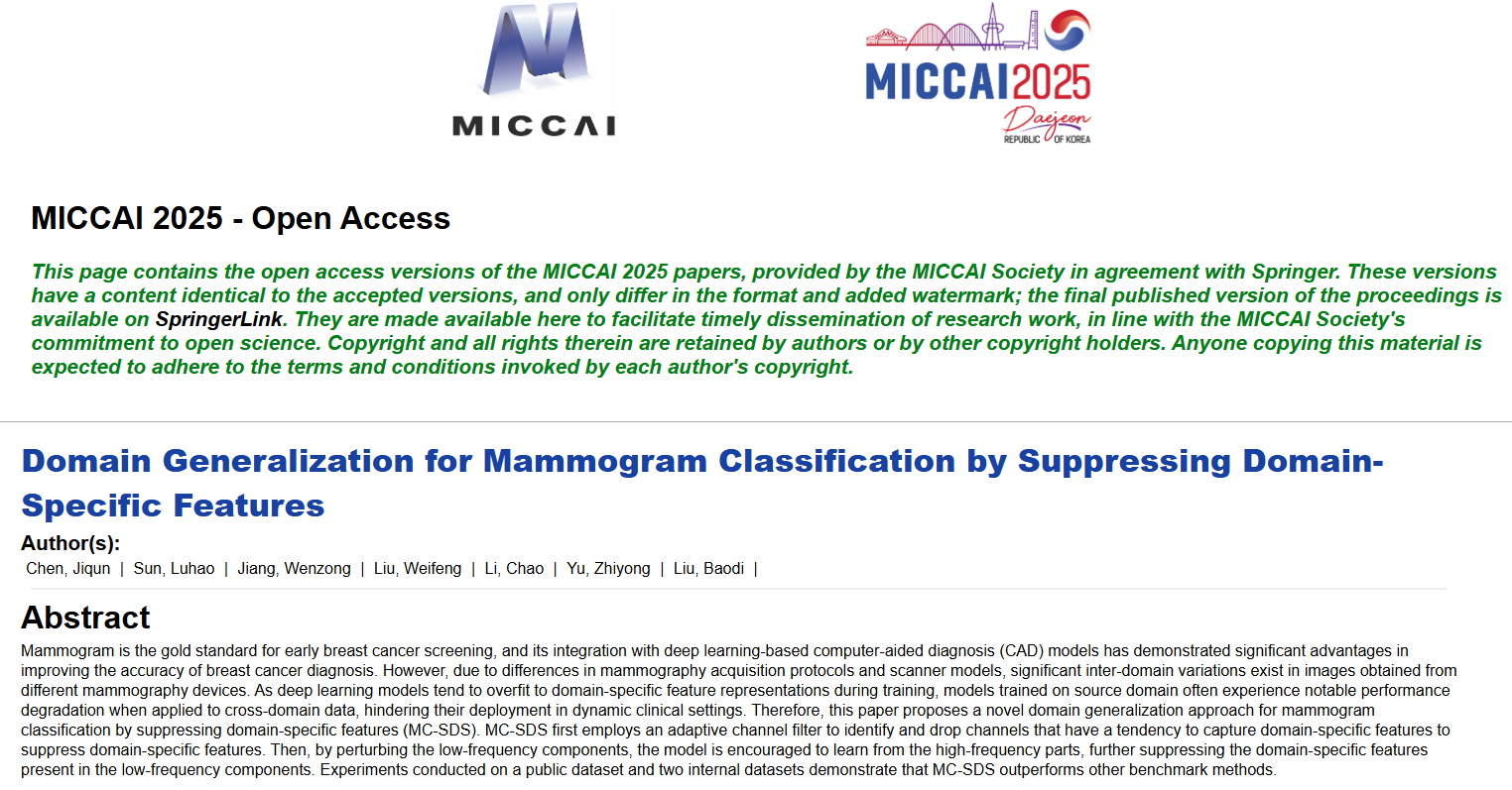 针对不同型号钼靶设备获取图像存在显著差异导致的模型性能下降问题,团队提出MC-SDS域泛化方法,通过抑制域相关特征对模型的错误影响,有效降低了模型在不同乳腺钼靶影像数据集中出现错误分类的风险,显著提升了模型的泛化能力。该成果发表于医学成像领域顶级会议MICCAI,刘宝弟副教授为通讯作者。