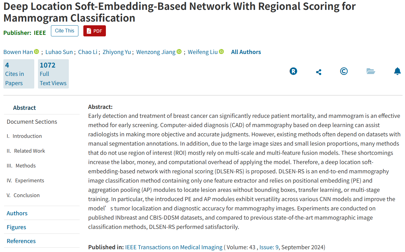 针对现有计算机辅助诊断系统依赖昂贵病灶标注数据的问题,团队提出DLSEN-RS网络结构,通过位置嵌入与聚合池化模块,在无需边界框或分割标注的情况下,实现对乳腺钼靶图像中微小病灶的精准定位与分类。该方法模拟放射科医生逐区域扫描的诊断过程,通过双路径评分机制对特征图进行重加权,突出疑似恶性区域,并聚焦最具判别性的特征。在公开数据集INbreast和CBIS-DDSM上的实验表明,DLSEN-RS在分类精度与弱监督定位能力上均优于现有方法,且计算开销极小。该成果发表于《IEEE Transactions on Medical Imaging》,刘宝弟副教授为通讯作者。