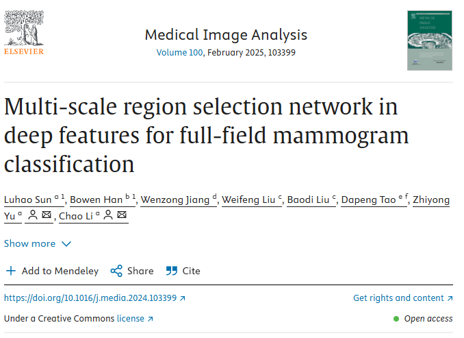 针对全视野乳腺钼靶图像中病灶区域小、背景干扰多的问题,研究团队提出MRSN端到端深度学习框架,通过多尺度区域选择机制,在无需ROI标注的情况下,实现对全视野图像中肿瘤区域的精准聚焦与分类。MRSN通过通道与空间双路径的区域评分与选择策略,模拟放射科医生的诊断逻辑,先过滤无关背景信息,再筛选最具代表性的肿瘤特征区域进行预测。在包括私有临床数据集在内的三个数据集上,MRSN均达到最先进性能,其分类准确率接近甚至部分超越基于patch的分类器,同时具备优异的弱监督定位能力。该成果发表于《Medical Image Analysis》。