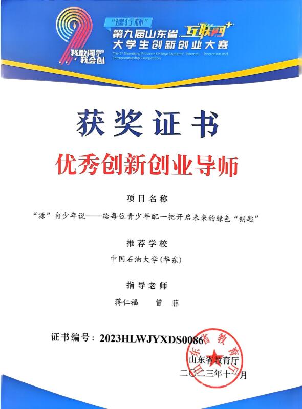 图16 辅导员蒋仁福、曾菲获评山东省优秀创新创业导师承浩