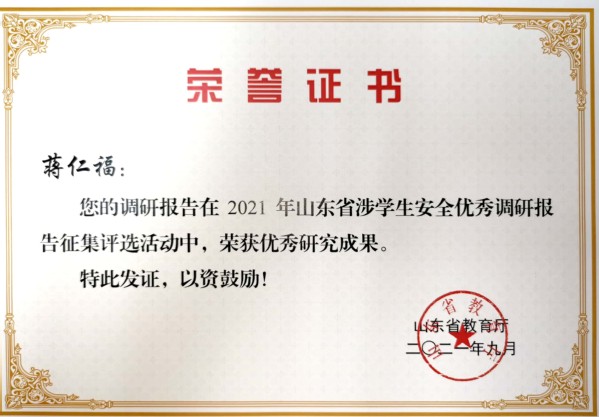 图13 辅导员曾菲参加高校辅导员综合素质能力训练营获优秀展示奖2 图14 蒋仁福获评2021年山东省涉学生安全优秀调研报告征集获评优秀研究成果