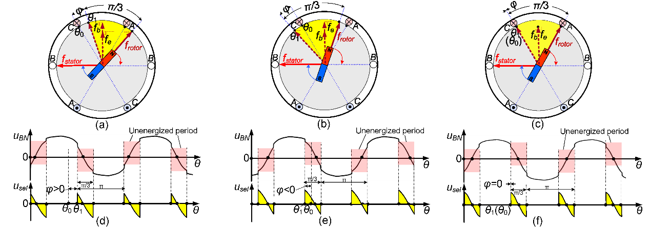 无刷直流电机无位置传感器换相技术,以其低成本、高可靠性的优势,已成为电机控制领域的关键技术,但其在应用方面仍面临挑战:控制系统中非理想环节引起的累积误差、电信号检测的抖动误差,以及电机运行过程中参数变化引入的误差,均会导致无位置换相控制精度降低,进而电机转矩恶化,能耗增加甚至造成电机失步或停转。为解决以上问题,团队提出基于反电动势自适应阈值电压比较电路的自校正换相方法,分析了电机运行时非导通相的磁链变化偏移特性,结合电机相电压于非导通区间展现出的反电动势畸变类型,建立了反电动势及其积分信号与换相误差之间的相关性;同时首次提出了信号积分区间对称缩减技术,有效规避了换相时刻电机驱动电路中的二极管续流干扰;创新性的设计了“偏置电压发生器”与“基于硬件的磁链调节器”,构造自适应阈值电压输入换相信号检测电路,实时调节换相状态,进而搭建了具有自校正能力的无位置传感器闭环控制系统。