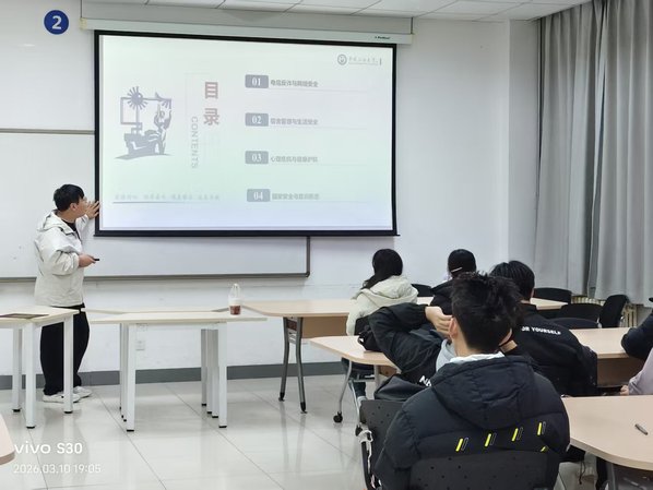 3月11日,2024级开学第一课及年级大会在西环201举行,辅导员王早、齐志伟分别主持相关环节。活动围绕电信网络诈骗防范、校园电动车管理、宿舍安全规范、校外防溺水、心理健康调节、总体国家安全观等核心内容展开,提醒学生妥善保管个人信息、杜绝宿舍违规危险行为、重视校内外出行安全,引导学生主动调节情绪、寻求心理帮助,自觉抵制错误思潮,履行维护国家利益的责任。