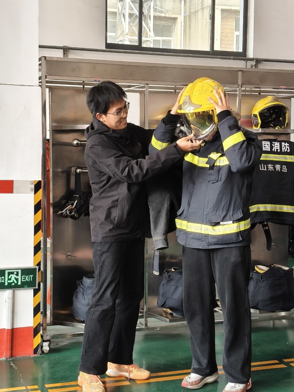 图三 同学体验专业消防灭火服 魏子瑜摄